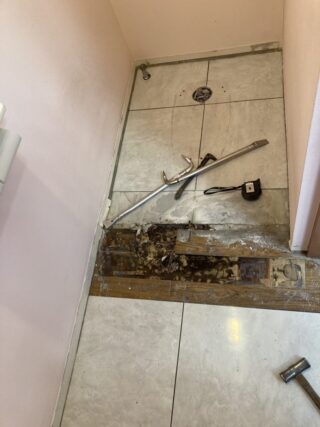 床を開けてみたところ、便器側がコンクリート、べこべこしていた側が木の下地になっていました🙀