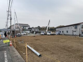 解体を終え、続いて電線切り回しのために電柱の建柱をし、道路拡幅工事が本格的に始まります