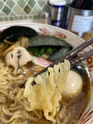 手揉みの平打ちピロピロ麺が生姜香る極上スープを口の中に運んできます