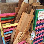 トヨダのStudio前にカラフルなコンテナが2台あります。 中を覗くと木材の端材です。