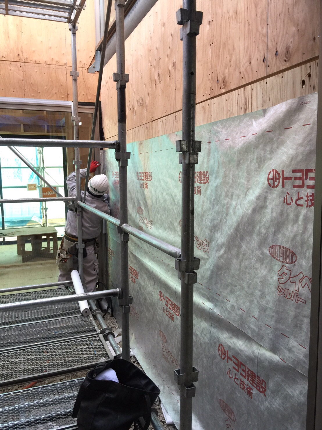 外回りはサッシ取付とタイベックもほぼ張り終わり、まもなく雨仕舞い完了〜^ ^